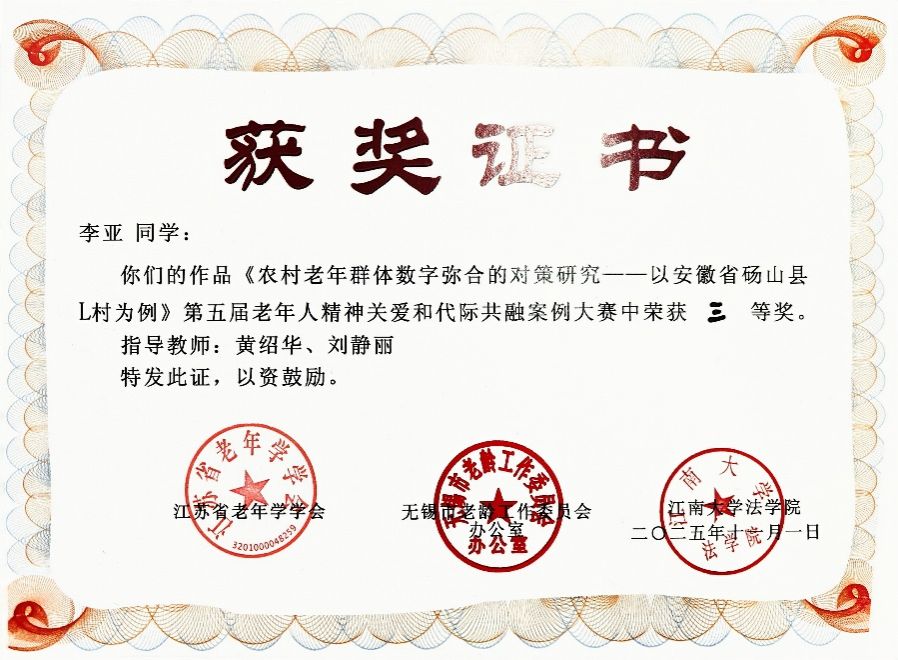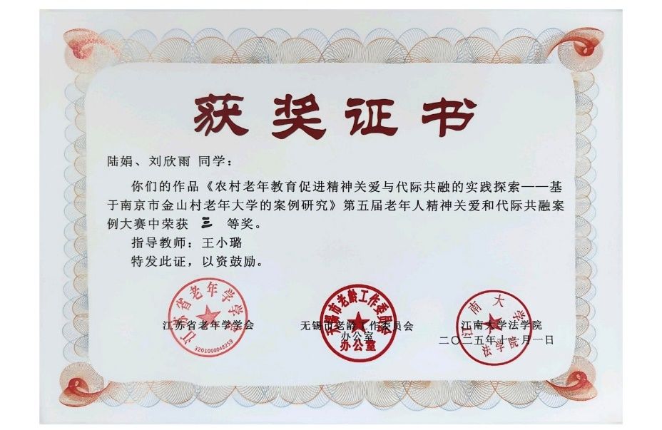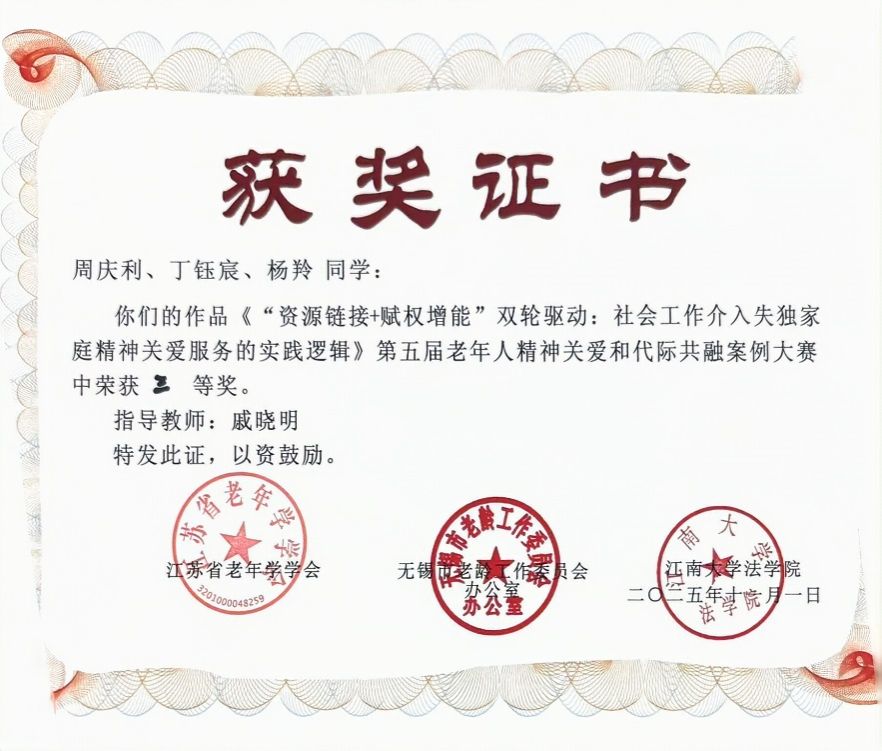 社会工作研究生陆娟、刘欣雨、周庆利、杨羚、李亚参加了大赛,周庆利团队的《“资源链接+赋权增能”双轮驱动:社会工作介入失独家庭精神关爱服务的实践逻辑》、陆娟团队的《农村老年教育促进精神关爱与代际共融的实践探索——基于南京市金山村老年大学的案例研究》、李亚的《农村老年群体数字弥合路径的对策研究——以安徽省砀山县L村为例》,均荣获三等奖。